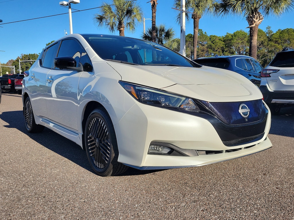 121/98 City/Highway MPG Backup Camera, Apple CarPlay / Android Auto, Alloy Wheels, Bluetooth Hands Free, Heated Seats, Lane Departure Warning, Adaptive Cruise Control, One Owner, 4-Wheel Disc Brakes, 6 Speakers, ABS brakes, Air Conditioning, AM/FM radio: SiriusXM, Auto High-beam Headlights, Automatic temperature control, Brake assist, Delay-off headlights, Dual front impact airbags, Dual front side impact airbags, Electronic Stability Control, Emergency communication system, Front fog lights, Front wheel independent suspension, Fully automatic headlights, Low tire pressure warning, Navigation system: NissanConnect EV w/Navigation and Services, NissanConnect Services Powered by SiriusXM, Occupant sensing airbag, Overhead airbag, Power driver seat, Power steering, Power windows, Radio data system, Radio: NissanConnect EV w/Navigation/SiriusXM, Rear anti-roll bar, Rear Parking Sensors, Rear side impact airbag, Rear window defroster, Remote keyless entry, Speed-sensing steering, Steering wheel mounted audio controls, Traction control. Certified. CARFAX One-Owner. Clean CARFAX.Super Black/Pearl White 2024 Nissan Leaf SV Plus FWD Single Speed Reducer Electric Motor