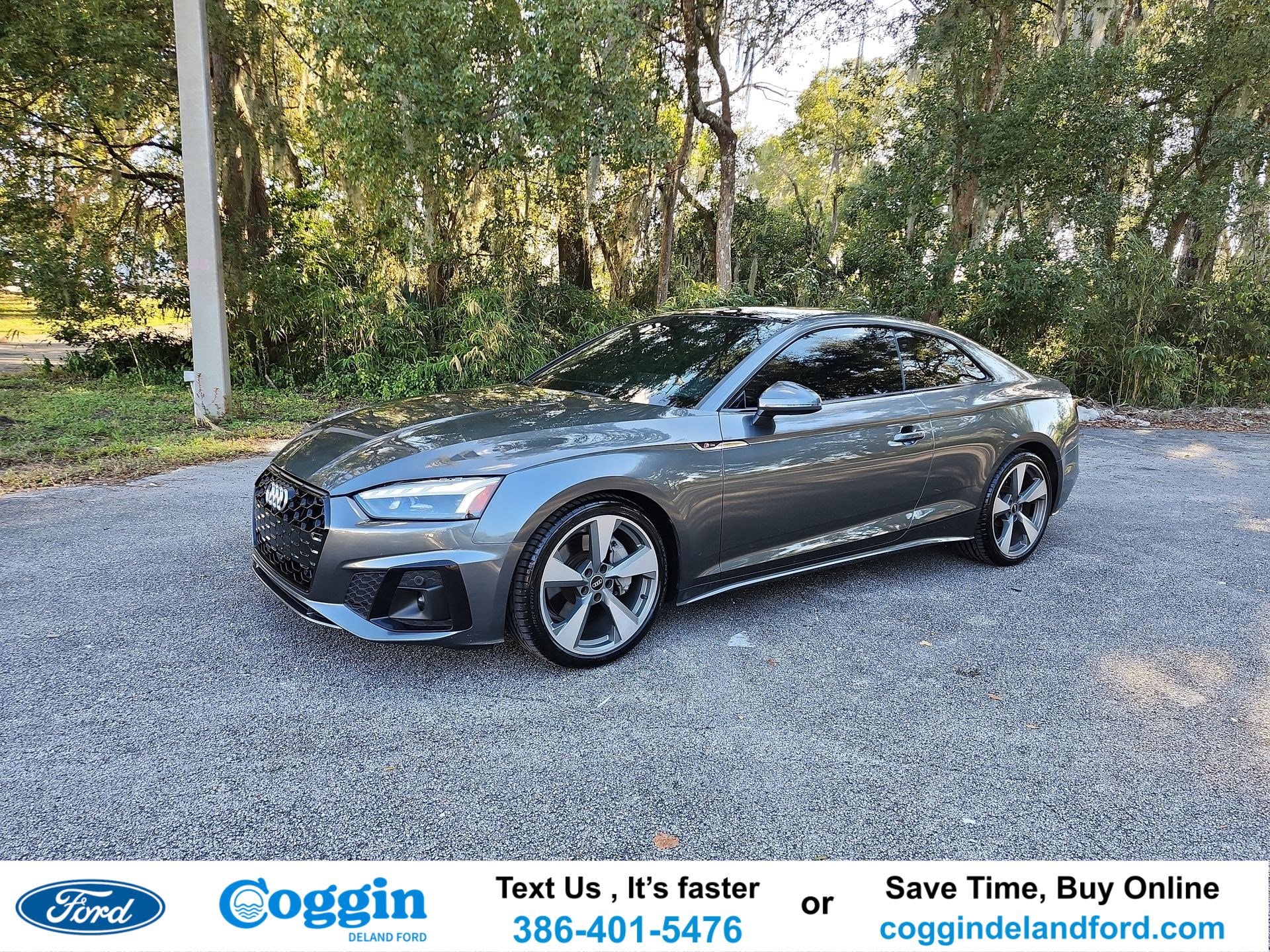 Check out all these options: quattro, Black Leather, 10 Speakers, 4-Wheel Disc Brakes, ABS brakes, Air Conditioning, Alloy wheels, AM/FM radio, Anti-whiplash front head restraints, Audi smartphone interface with Apple CarPlay, Auto High-beam Headlights, Auto-dimming Rear-View mirror, Automatic temperature control, Brake assist, Bumpers: body-color, Compass, Delay-off headlights, Driver door bin, Driver vanity mirror, Dual front impact airbags, Dual front side impact airbags, Electronic Stability Control, Emergency communication system: Audi connect CARE, Exterior Parking Camera Rear, Four wheel independent suspension, Front anti-roll bar, Front Bucket Seats, Front Center Armrest, Front dual zone A/C, Front fog lights, Front reading lights, Garage door transmitter: HomeLink, Genuine wood console insert, Genuine wood dashboard insert, Genuine wood door panel insert, Heated door mirrors, Heated front seats, Heated Front Sport Seats, Illuminated entry, Knee airbag, Leather Seating Surfaces, Leather Shift Knob, Leather steering wheel, Low tire pressure warning, Occupant sensing airbag, Outside temperature display, Overhead airbag, Overhead console, Panic alarm, Passenger door bin, Passenger vanity mirror, Power adjustable front head restraints, Power door mirrors, Power driver seat, Power moonroof, Power passenger seat, Power steering, Power windows, Radio data system, Radio: Audi Sound System, Rain sensing wipers, Rear air conditioning, Rear anti-roll bar, Rear reading lights, Rear seat center armrest, Rear window defroster, Remote keyless entry, Speed control, Speed-sensing steering, Speed-Sensitive Wipers, Split folding rear seat, Steering wheel mounted audio controls, Tachometer, Telescoping steering wheel, Tilt steering wheel, Traction control, Trip computer, Turn signal indicator mirrors, Variably intermittent wipers, and Wheels: 18 5-Double-Spoke-Star Design. Recent Arrival! 2021 Audi A5 Daytona Gray 7-Speed Automatic S tronic 2D Coupe 2.0L 4-Cylinder TFSI quattro